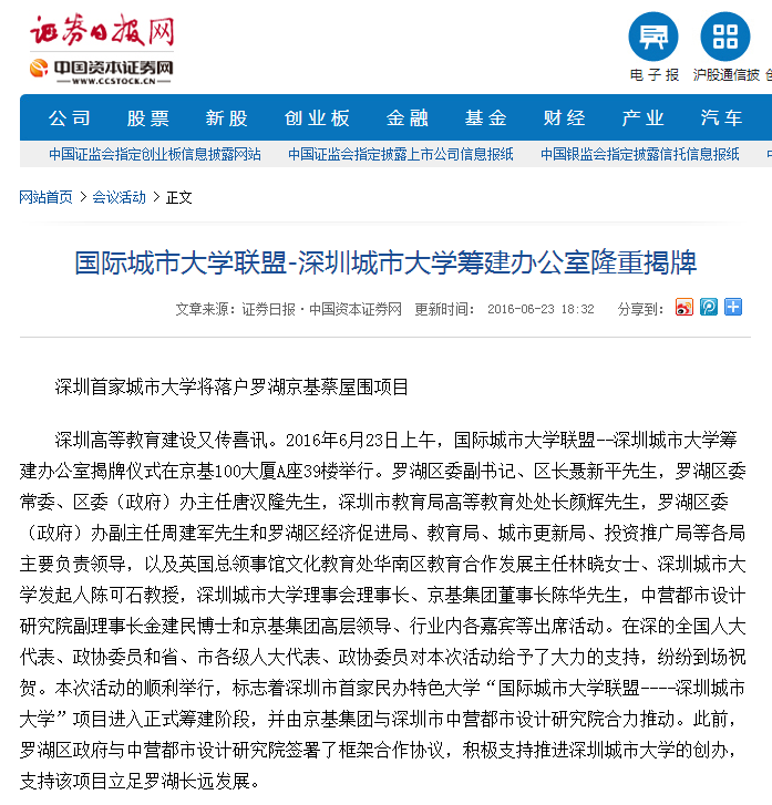 京基集团自1994年成立以来,经过二十多年的成长,现已发展成为集房地产开发与经营、商业开发与经营、酒店开发与经营、物业管理、餐饮经营与管理、金融资本运作、高尔夫、动画文化等八大领域的多元化、综合性集团。京基集团以深圳地标建筑“京基100”而闻名,所创造的“蔡屋围模式”成为深圳城市更新的典范之作,京基蔡屋围城市更新项目是其在罗湖区又一城市更新标杆性力作。该项目规划总建筑面积约430万平方米,包括超甲级写字楼、大型商业、高星级酒店、高端住宅、公寓、教育文化配套等多种业态,得到罗湖区委区政府的高度重视,目前正在有序推进中。国际城市大学联盟--深圳城市大学并不是蔡屋围城市更新项目首次“触电”教育产业,早在2013年5月,京基集团就与普林斯顿教育中心和美国曼哈顿音乐学院签约,约定将学院的国际校址落户在该项目上。