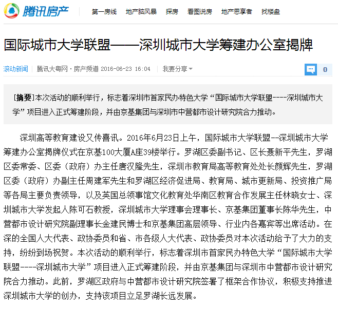 深圳高等教育建设又传喜讯。2016年6月23日上午,国际城市大学联盟--深圳城市大学筹建办公室揭牌仪式在京基100大厦A座39楼举行。罗湖区委副书记、区长聂新平先生,罗湖区委常委、区委(政府)办主任唐汉隆先生,深圳市教育局高等教育处处长颜辉先生,罗湖区委(政府)办副主任周建军先生和罗湖区经济促进局、教育局、城市更新局、投资推广局等各局主要负责领导,以及英国总领事馆文化教育处华南区教育合作发展主任林晓女士、深圳城市大学发起人陈可石教授,深圳城市大学理事会理事长、京基集团董事长陈华先生,中营都市设计研究院副理事长金建民博士和京基集团高层领导、行业内各嘉宾等出席活动。在深的全国人大代表、政协委员和省、市各级人大代表、政协委员对本次活动给予了大力的支持,纷纷到场祝贺。本次活动的顺利举行,标志着深圳市首家民办特色大学“国际城市大学联盟----深圳城市大学”项目进入正式筹建阶段,并由京基集团与深圳市中营都市设计研究院合力推动。此前,罗湖区政府与中营都市设计研究院签署了框架合作协议,积极支持推进深圳城市大学的创办,支持该项目立足罗湖长远发展。