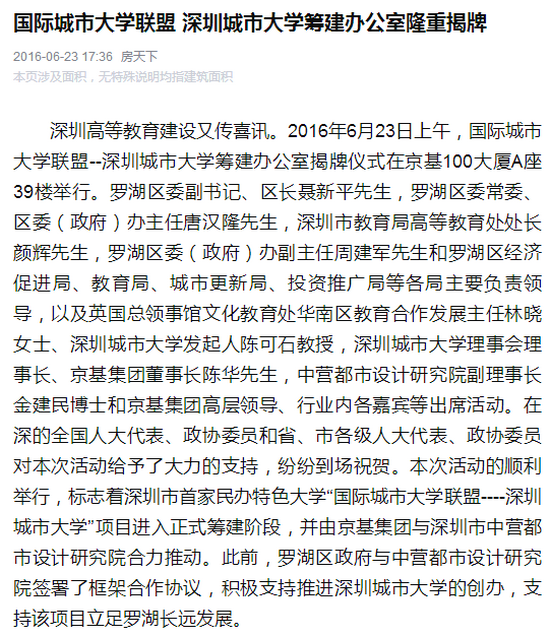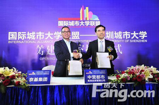 京基集团自1994年成立以来,经过二十多年的成长,现已发展成为集房地产开发与经营、商业开发与经营、酒店开发与经营、物业管理、餐饮经营与管理、金融资本运作、高尔夫、动画文化等八大领域的多元化、综合性集团。京基集团以深圳地标建筑“京基100”而闻名,所创造的“蔡屋围模式”成为深圳城市更新的典范之作,京基蔡屋围城市更新项目是其在罗湖区又一城市更新标杆性力作。该项目规划总建筑面积约430万平方米,包括超甲级写字楼、大型商业、高星级酒店、高端住宅、公寓、教育文化配套等多种业态,得到罗湖区委区政府的高度重视,目前正在有序推进中。国际城市大学联盟--深圳城市大学并不是蔡屋围城市更新项目首次“触电”教育产业,早在2013年5月,京基集团就与普林斯顿教育中心和美国曼哈顿音乐学院签约,约定将学院的国际校址落户在该项目上。