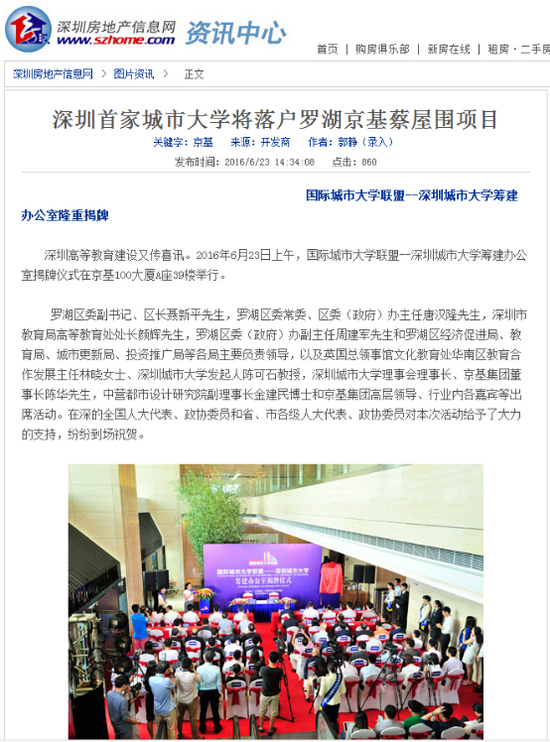 京基集团自1994年成立以来,经过二十多年的成长,现已发展成为集房地产开发与经营、商业开发与经营、酒店开发与经营、物业管理、餐饮经营与管理、金融资本运作、高尔夫、动画文化等八大领域的多元化、综合性集团。京基集团以深圳地标建筑“京基100”而闻名,所创造的“蔡屋围模式”成为深圳城市更新的典范之作,京基蔡屋围城市更新项目是其在罗湖区又一城市更新标杆性力作。该项目规划总建筑面积约430万平方米,包括超甲级写字楼、大型商业、高星级酒店、高端住宅、公寓、教育文化配套等多种业态,得到罗湖区委区政府的高度重视,目前正在有序推进中。国际城市大学联盟--深圳城市大学并不是蔡屋围城市更新项目首次“触电”教育产业,早在2013年5月,京基集团就与普林斯顿教育中心和美国曼哈顿音乐学院签约,约定将学院的国际校址落户在该项目上。