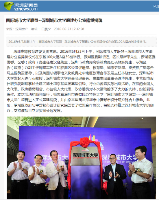 深圳高等教育建设又传喜讯。2016年6月23日上午,国际城市大学联盟--深圳城市大学筹建办公室揭牌仪式在京基100大厦A座39楼举行。罗湖区委副书记、区长聂新平先生,罗湖区委常委、区委(政府)办主任唐汉隆先生,深圳市教育局高等教育处处长颜辉先生,罗湖区委(政府)办副主任周建军先生和罗湖区经济促进局、教育局、城市更新局、投资推广局等各局主要负责领导,以及英国总领事馆文化教育处华南区教育合作发展主任林晓女士、深圳城市大学发起人陈可石教授,深圳城市大学理事会理事长、京基集团董事长陈华先生,中营都市设计研究院副理事长金建民博士和京基集团高层领导、行业内各嘉宾等出席活动。在深的全国人大代表、政协委员和省、市各级人大代表、政协委员对本次活动给予了大力的支持,纷纷到场祝贺。本次活动的顺利举行,标志着深圳市首家民办特色大学“国际城市大学联盟----深圳城市大学”项目进入正式筹建阶段,并由京基集团与深圳市中营都市设计研究院合力推动。此前,罗湖区政府与中营都市设计研究院签署了框架合作协议,积极支持推进深圳城市大学的创办,支持该项目立足罗湖长远发展。