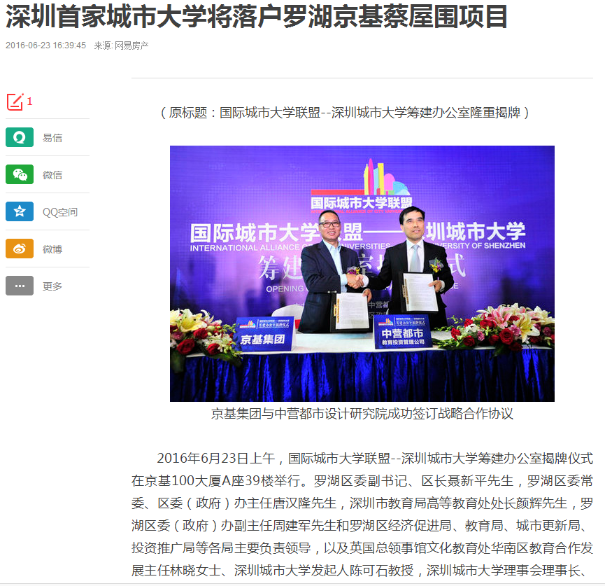 京基集团自1994年成立以来,经过二十多年的成长,现已发展成为集房地产开发与经营、商业开发与经营、酒店开发与经营、物业管理、餐饮经营与管理、金融资本运作、高尔夫、动画文化等八大领域的多元化、综合性集团。京基集团以深圳地标建筑“京基100”而闻名,所创造的“蔡屋围模式”成为深圳城市更新的典范之作,京基蔡屋围城市更新项目是其在罗湖区又一城市更新标杆性力作。该项目规划总建筑面积约430万平方米,包括超甲级写字楼、大型商业、高星级酒店、高端住宅、公寓、教育文化配套等多种业态,得到罗湖区委区政府的高度重视,目前正在有序推进中。国际城市大学联盟--深圳城市大学并不是蔡屋围城市更新项目首次“触电”教育产业,早在2013年5月,京基集团就与普林斯顿教育中心和美国曼哈顿音乐学院签约,约定将学院的国际校址落户在该项目上。