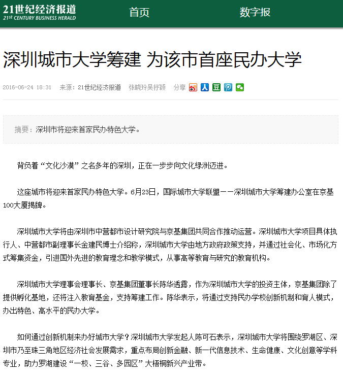 这座城市将迎来首家民办特色大学。6月23日,国际城市大学联盟——深圳城市大学筹建办公室在京基100大厦揭牌。