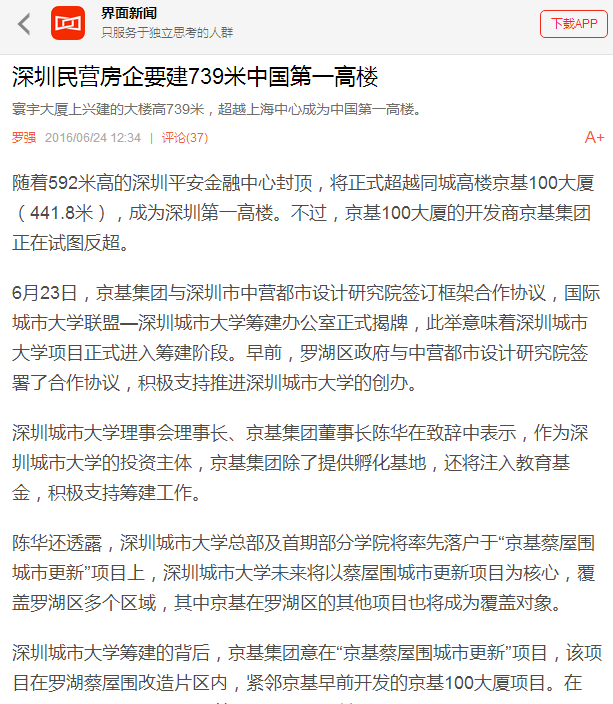 深圳城市大学筹建的背后,京基集团意在“京基蔡屋围城市更新”项目,该项目在罗湖蔡屋围改造片区内,紧邻京基早前开发的京基100大厦项目。在2013年城市更新单元计划第一批计划中,该项目的申报主体为深圳市罗湖区重建局、深圳市京基房地产股份有限公司,重建面积高达30.8万平方米。