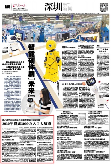 樊纲介绍,七八年前其提出一个概念,说深圳将来(我们那时候说的是2050年)有3000万人口,那时候一个基本的想法就是,深圳如果不能养活3000万人口,就辜负了这块宝地。我们发展中国家快速工业化,首先肯定是大城市的集中,按现在的发展速度,预计2030年就可以达到3000万了。这3000万人口,讲的是经济活动人口,就是白天到你这里上班的和晚上到你这里看戏的可能不是同一拨人,白天上班的人不一定晚上看戏,晚上看戏的人不一定白天在这里上班。现在其实深圳很多人都到东莞、惠州等地居住了,他们又在这里上班,还有香港人来深圳上班,这都属于经济活动人口。