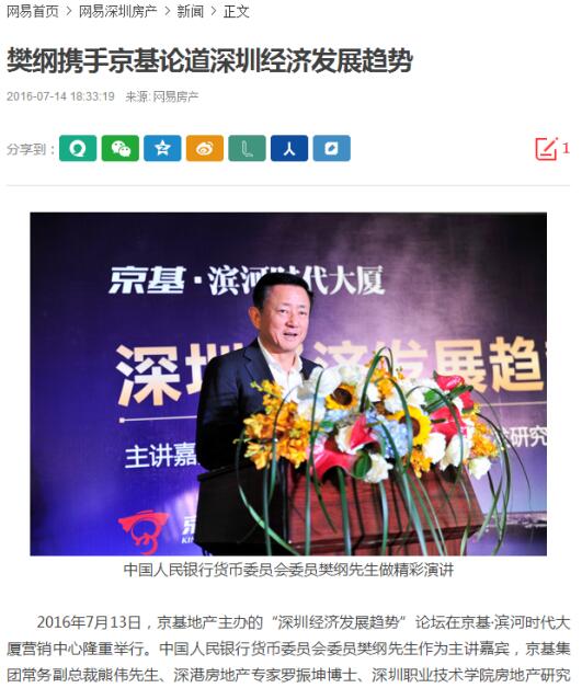 2016年7月13日,京基地产主办的“深圳经济发展趋势”论坛在京基·滨河时代大厦营销中心隆重举行。中国人民银行货币委员会委员樊纲先生作为主讲嘉宾,京基集团常务副总裁熊伟先生、深港房地产专家罗振坤博士、深圳职业技术学院房地产研究所所长邓志旺博士、京基地产营销管理中心副总经理赵亮先生等京基高层、深港两地的地产专家出席此次活动,共同探讨深圳经济未来的发展趋势。在论坛上,樊纲先生就深圳经济实现快速发展进行全方位、多角度的解读,其精彩的言论引发现场强烈共鸣。