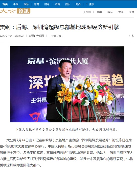 大公网7月14日讯(记者熊君慧)京基地产主办的“深圳经济发展趋势”论坛昨日在京基?滨河时代大厦营销中心举行。中国人民银行货币委员会委员樊纲就深圳经济实现快速发展进行全方位、多角度的解读,其精彩的言论引发现场强烈共鸣。他认为,深圳目前正在大力推进后海总部经济以及深圳湾超级总部基地的建设,就是未来发展雄心的最好表现,也将引领深圳成为国际化大都市。