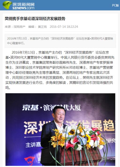 2016年7月13日,京基地产主办的“深圳经济发展趋势”论坛在京基?滨河时代大厦营销中心隆重举行。中国人民银行货币委员会委员樊纲先生作为主讲嘉宾,京基集团常务副总裁熊伟先生、深港房地产专家罗振坤博士、深圳职业技术学院房地产研究所所长邓志旺博士、京基地产营销管理中心副总经理赵亮先生等京基高层、深港两地的地产专家出席此次活动,共同探讨深圳经济未来的发展趋势。在论坛上,樊纲先生就深圳经济实现快速发展进行全方位、多角度的解读,其精彩的言论引发现场强烈共鸣。