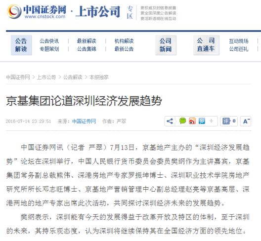 7月13日,京基地产主办的“深圳经济发展趋势”论坛在深圳举行,中国人民银行货币委员会委员樊纲作为主讲嘉宾,京基集团常务副总裁熊伟、深港房地产专家罗振坤博士、深圳职业技术学院房地产研究所所长邓志旺博士、京基地产营销管理中心副总经理赵亮等京基高层、深港两地的地产专家出席此次活动,共同探讨深圳经济未来的发展趋势。