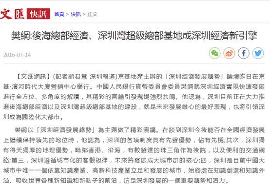 京基地產主辦的「深圳經濟發展趨勢」論壇昨日在京基?濱河時代大廈營銷中心舉行。中國人民銀行貨幣委員會委員樊綱就深圳經濟實現快速發展進行全方位、多角度的解讀,其精彩的言論引發現場強烈共鳴。他認為,深圳目前正在大力推進後海總部經濟以及深圳灣超級總部基地的建設,就是未來發展雄心的最好表現,也將引領深圳成為國際化大都市。