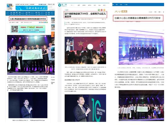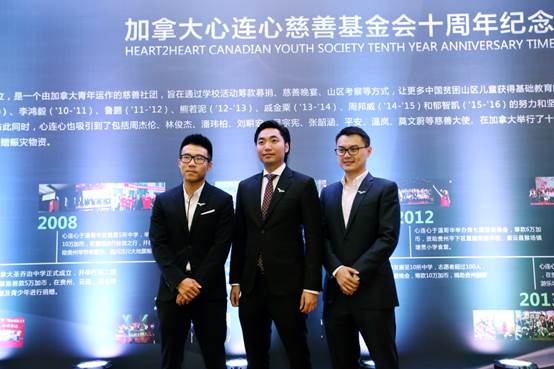 2016年8月20日晚,加拿大心连心慈善基金会(以下简称:心连心)10周年庆筹款晚宴在深圳瑞吉酒店盛大举行,主题为“十年少年梦 共铸心连心”。心连心发起人、京基集团副总裁陈家荣先生,心连心发起人黄韬先生、朱英楠先生和心连心历届主席、成员,中国留学生爱心助学基金秘书长黄鹃娟女士以及京基集团高层、省市20多家媒体共近400人出席晚宴。徐乃麟、刘畊宏、罗文裕等知名明星也亲临现场鼎力支持。当晚,通过现场义捐和爱心拍卖共募集善款209万元,全额捐赠给中国留学生爱心助学基金,作为“心连心专项奖学金”,用于贫困山区儿童助学项目。