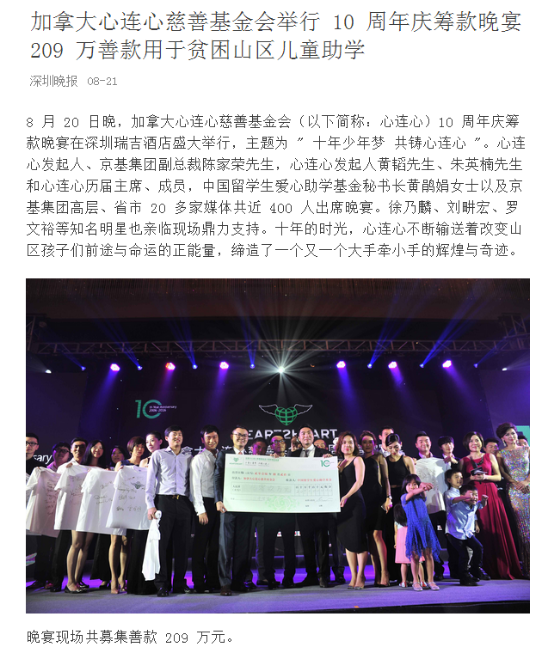 8 月 20 日晚,加拿大心连心慈善基金会(以下简称:心连心)10 周年庆筹款晚宴在深圳瑞吉酒店盛大举行,主题为 " 十年少年梦 共铸心连心 "。心连心发起人、京基集团副总裁陈家荣先生,心连心发起人黄韬先生、朱英楠先生和心连心历届主席、成员,中国留学生爱心助学基金秘书长黄鹃娟女士以及京基集团高层、省市 20 多家媒体共近 400 人出席晚宴。徐乃麟、刘畊宏、罗文裕等知名明星也亲临现场鼎力支持。十年的时光,心连心不断输送着改变山区孩子们前途与命运的正能量,缔造了一个又一个大手牵小手的辉煌与奇迹。
