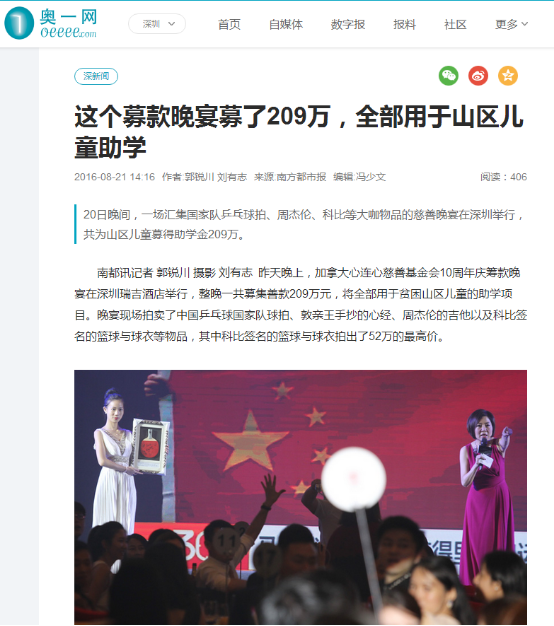 昨天晚上,加拿大心连心慈善基金会10周年庆筹款晚宴在深圳瑞吉酒店举行,整晚一共募集善款209万元,将全部用于贫困山区儿童的助学项目。晚宴现场拍卖了中国乒乓球国家队球拍、敦亲王手抄的心经、周杰伦的吉他以及科比签名的篮球与球衣等物品,其中科比签名的篮球与球衣拍出了52万的最高价。