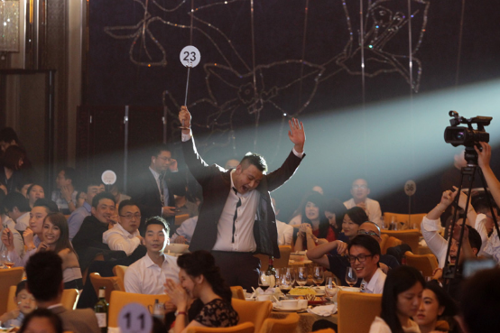 上图:2016年8月20日晚,深圳京基100大厦瑞吉酒店,“加拿大心连心慈善基金会10周年庆典”现场,举牌参与拍卖环节的嘉宾。