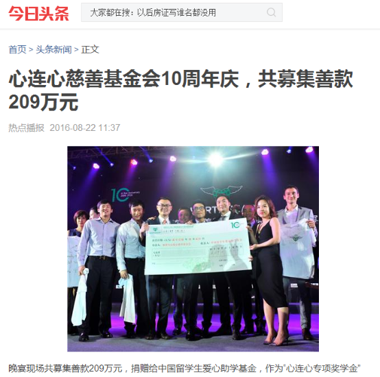 晚宴现场共募集善款209万元,捐赠给中国留学生爱心助学基金,作为“心连心专项奖学金”
