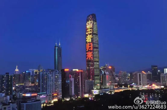 随着中国女排夺金,整个中华大地都陷入了狂欢,深圳京基100大厦更是在幕墙广告上祝贺中国女排,”王者归来”四个大字相当显眼。