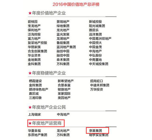 近日,由每日经济新闻和成都商报社联合主办的“第六届中国价值地产年会暨2016年中国城市价值白皮书发布会”在成都举行。年会公布了2016年中国价值地产总评榜,京基集团与万科集团、龙光地产、华夏幸福等全国性知名企业同上榜单,荣获“年度地产运营商”称号。