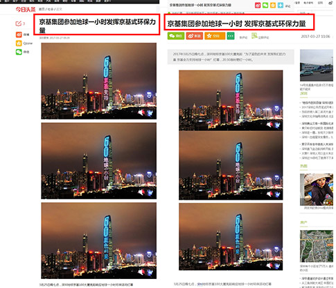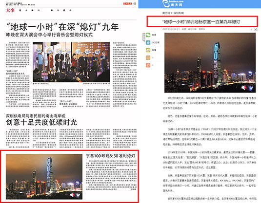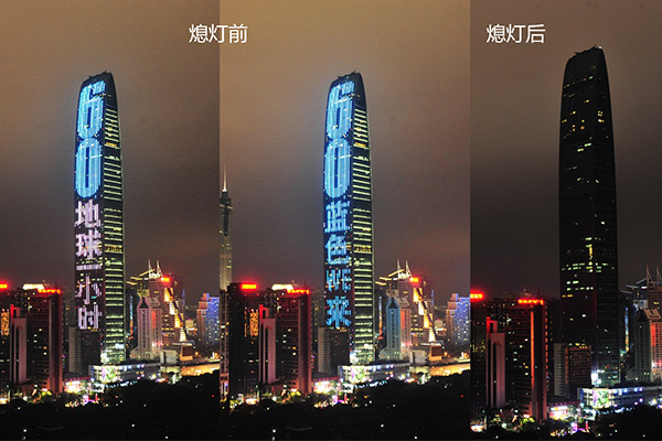 2017年3月25日晚七点,深圳地标京基100大厦亮起“为了蓝色的未来 发挥我们的力量 京基全力支持地球一小时”灯幕,20:30准时熄灯一小时。据悉,这是京基集团旗下写字楼、住宅、商场、酒店各项目持续第9年响应地球一小时环保活动,为找回蓝天发挥京基式力量。