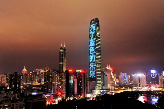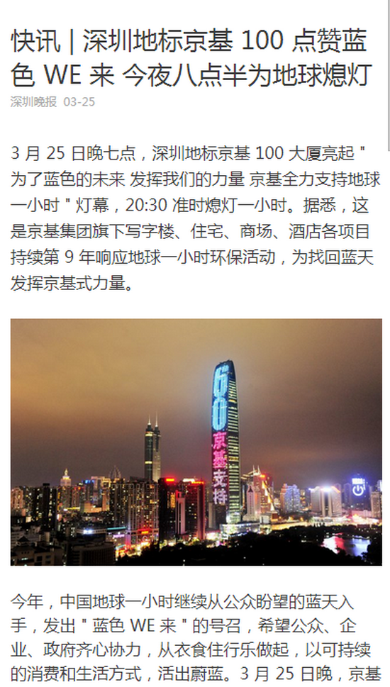 3月25日晚七点,深圳地标京基 100 大厦亮起 " 为了蓝色的未来 发挥我们的力量 京基全力支持地球一小时 " 灯幕,20:30 准时熄灯一小时。据悉,这是京基集团旗下写字楼、住宅、商场、酒店各项目持续第9年响应地球一小时环保活动,为找回蓝天发挥京基式力量。