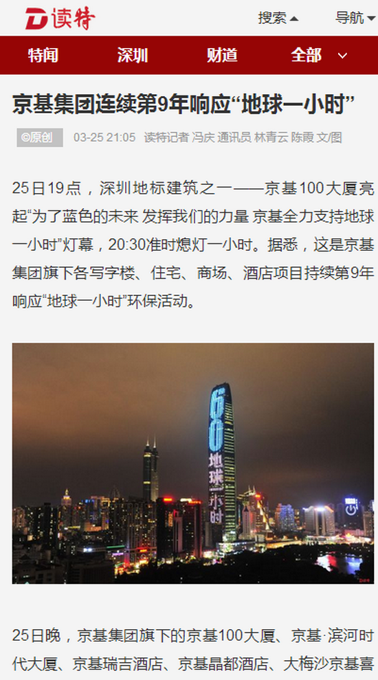 25日19点,深圳地标建筑之一——京基100大厦亮起“为了蓝色的未来 发挥我们的力量 京基全力支持地球一小时”灯幕,20:30准时熄灯一小时。据悉,这是京基集团旗下各写字楼、住宅、商场、酒店项目持续第9年响应“地球一小时”环保活动。