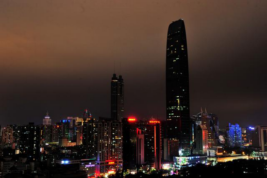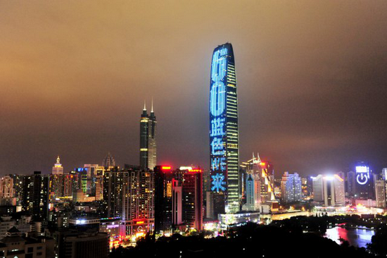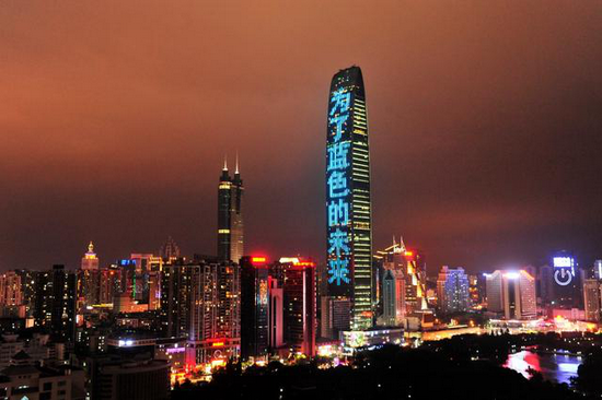 3月25日晚七点,深圳地标京基100大厦亮起响应地球一小时环保活动灯幕