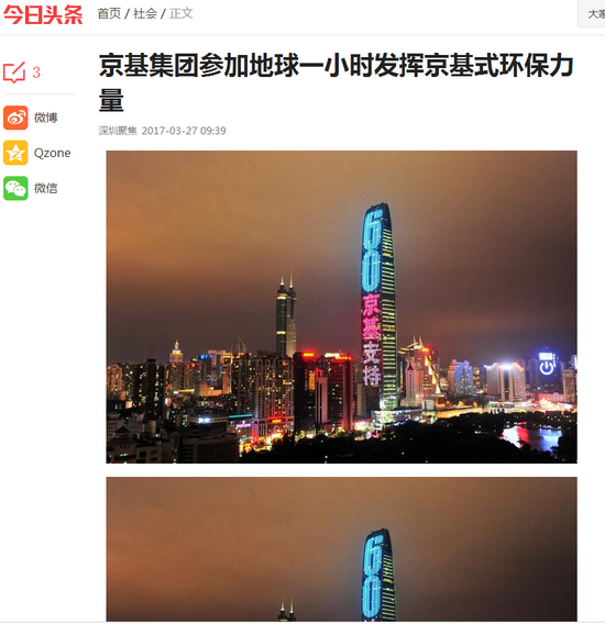 2017年3月25日晚七点,深圳地标京基100大厦亮起“为了蓝色的未来 发挥我们的力量 京基全力支持地球一小时”灯幕,20:30准时熄灯一小时。据悉,这是京基集团旗下写字楼、住宅、商场、酒店各项目持续第9年响应地球一小时环保活动,为找回蓝天发挥京基式力量。
