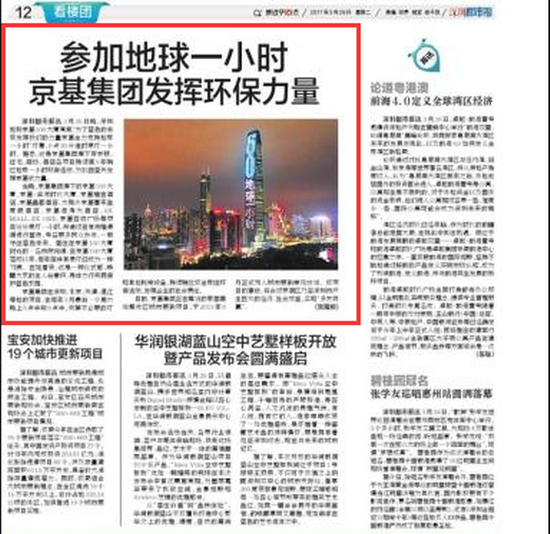 京基集团在深圳、北京、天津、湛江等地的项目,在每年3月最后一个周六晚上8点半到9点半,关掉不必要的灯和其他耗电设备,持续响应该全球性环保活动,发挥企业的社会责任。