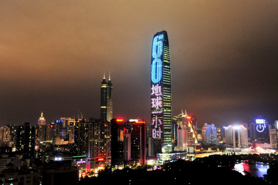 3月25日晚七点,深圳地标京基100大厦亮起响应地球一小时环保活动灯幕