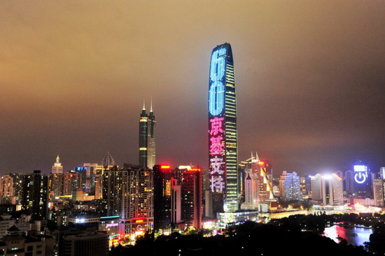 3月25日晚七点,深圳地标京基100大厦亮起响应地球一小时环保活动灯幕