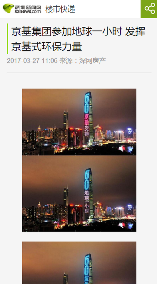 2017年3月25日晚七点,深圳地标京基100大厦亮起“为了蓝色的未来 发挥我们的力量 京基全力支持地球一小时”灯幕,20:30准时熄灯一小时。据悉,这是京基集团旗下写字楼、住宅、商场、酒店各项目持续第9年响应地球一小时环保活动,为找回蓝天发挥京基式力量。