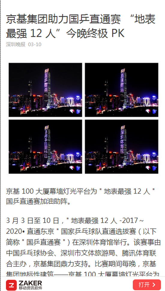 3月3日至10日,"地表最强12人-2017~2020•直通东京"国家乒乓球队直通选拔赛(以下简称"国乒直通赛 ")在深圳体育馆举行。该赛事由中国乒乓球协会、深圳市文体旅游局、腾讯体育联合主办,京基集团鼎力支持。比赛期间每晚,京基集团地标性建筑——京基100大厦幕墙灯光平台为这场乒乓球盛宴加油助阵,助力中国乒乓球队打造最顶级水准的专业赛事,为中国体育改革添砖加瓦。此外,京基旗下多家酒店为参赛选手提供专享服务,保证其最佳比赛状态。