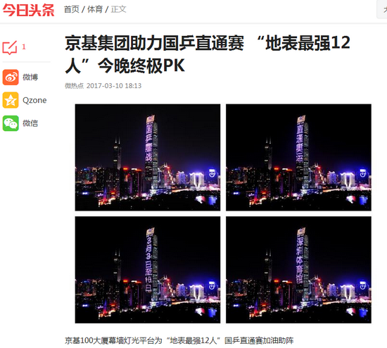 2017年3月3日至10日,“地表最强12人-2017~2020•直通东京”国家乒乓球队直通选拔赛(以下简称“国乒直通赛”)在深圳体育馆举行。该赛事由中国乒乓球协会、深圳市文体旅游局、腾讯体育联合主办,京基集团鼎力支持。比赛期间每晚,京基集团地标性建筑——京基100大厦幕墙灯光平台为这场乒乓球盛宴加油助阵,助力中国乒乓球队打造最顶级水准的专业赛事,为中国体育改革添砖加瓦。此外,京基旗下多家酒店为参赛选手提供专享服务,保证其最佳比赛状态。