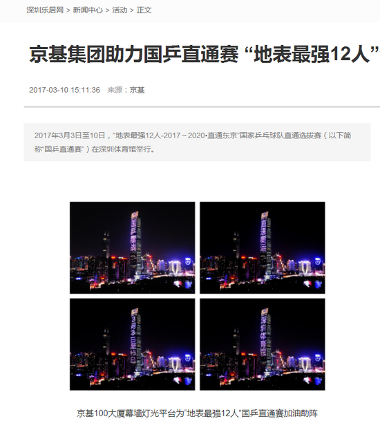 2017年3月3日至10日,“地表最强12人-2017~2020•直通东京”国家乒乓球队直通选拔赛(以下简称“国乒直通赛”)在深圳体育馆举行。该赛事由中国乒乓球协会、深圳市文体旅游局、腾讯体育联合主办,京基集团鼎力支持。比赛期间每晚,京基集团地标性建筑——京基100大厦幕墙灯光平台为这场乒乓球盛宴加油助阵,助力中国乒乓球队打造最顶级水准的专业赛事,为中国体育改革添砖加瓦。此外,京基旗下多家酒店为参赛选手提供专享服务,保证其最佳比赛状态。
