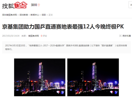 2017年3月3日至10日,“地表最强12人-2017~2020•直通东京”国家乒乓球队直通选拔赛(以下简称“国乒直通赛”)在深圳体育馆举行。该赛事由中国乒乓球协会、深圳市文体旅游局、腾 讯体育联合主办,京基集团鼎力支持。比赛期间每晚,京基集团地标性建筑——京基100大厦幕墙灯光平台为这场乒乓球盛宴加油助阵,助力中国乒乓球队打造最顶级水准的专业赛事,为中国体育改革添砖加瓦。此外,京基旗下多家酒店为参赛选手提供专享服务,保证其最佳比赛状态。