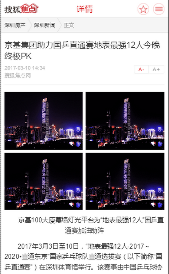 2017年3月3日至10日,“地表最强12人-2017~2020•直通东京”国家乒乓球队直通选拔赛(以下简称“国乒直通赛”)在深圳体育馆举行。该赛事由中国乒乓球协会、深圳市文体旅游局、腾 讯体育联合主办,京基集团鼎力支持。比赛期间每晚,京基集团地标性建筑——京基100大厦幕墙灯光平台为这场乒乓球盛宴加油助阵,助力中国乒乓球队打造最顶级水准的专业赛事,为中国体育改革添砖加瓦。此外,京基旗下多家酒店为参赛选手提供专享服务,保证其最佳比赛状态。