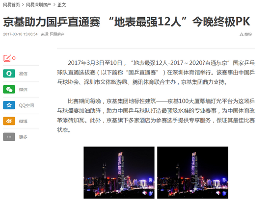 比赛期间每晚,京基集团地标性建筑——京基100大厦幕墙灯光平台为这场乒乓球盛宴加油助阵,助力中国乒乓球队打造最顶级水准的专业赛事,为中国体育改革添砖加瓦。此外,京基旗下多家酒店为参赛选手提供专享服务,保证其最佳比赛状态。