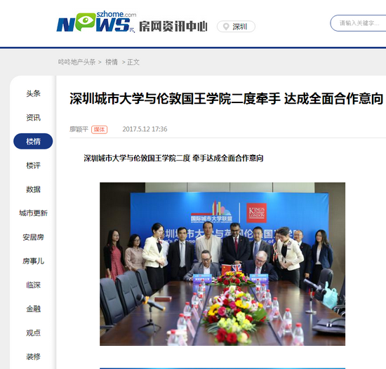 2017年5月11日上午,深圳城市大学与英国伦敦国王学院二度牵手,在京基100大厦A座72楼签订合作框架协议,约定未来双方的教育合作将实现全面化。这是继去年12月份双方就深圳城市大学下属的“大健康学院”和“物联网学院”项目签署相关合作协议后的再次携手。
