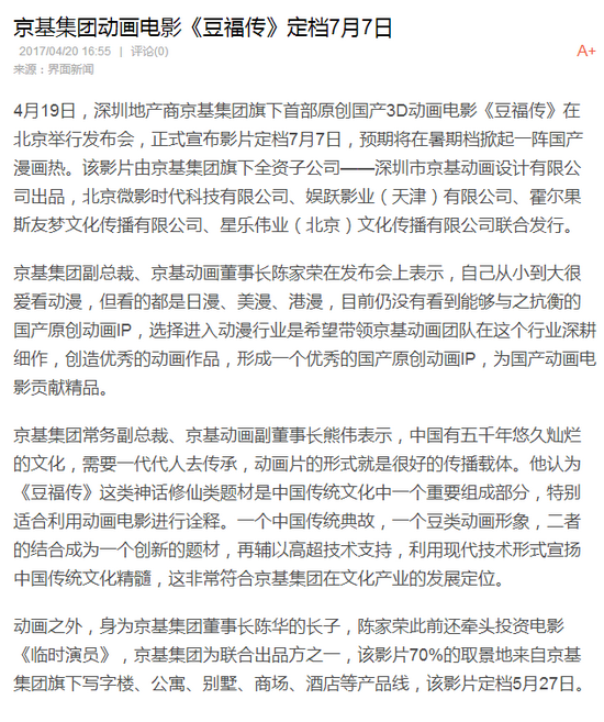 4月19日,深圳地产商京基集团旗下首部原创国产3D动画电影《豆福传》在北京举行发布会,正式宣布影片定档7月7日,预期将在暑期档掀起一阵国产漫画热。该影片由京基集团旗下全资子公司——深圳市京基动画设计有限公司出品,北京微影时代科技有限公司、娱跃影业(天津)有限公司、霍尔果斯友梦文化传播有限公司、星乐伟业(北京)文化传播有限公司联合发行。