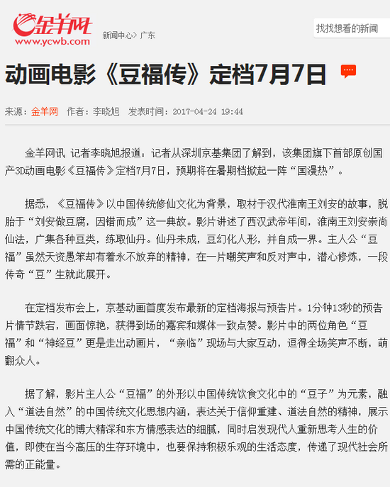 金羊网讯记者李晓旭报道:记者从深圳京基集团了解到,该集团旗下首部原创国产3D动画电影《豆福传》定档7月7日,预期将在暑期档掀起一阵“国漫热”。