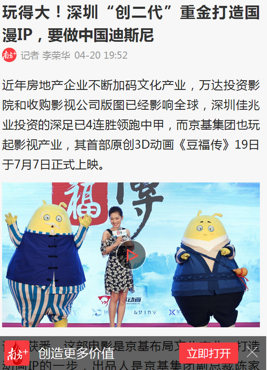 近年房地产企业不断加码文化产业,万达投资影院和收购影视公司版图已经影响全球,深圳佳兆业投资的深足已4连胜领跑中甲,而京基集团也玩起影视产业,其首部原创3D动画《豆福传》19日于7月7日正式上映。