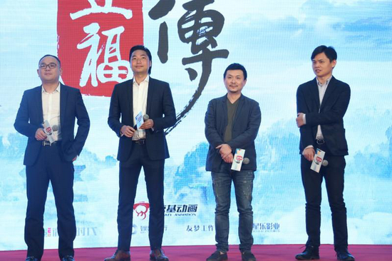 影片出品方、发行方相关领导上台分享投拍《豆福传》的初心,从左往右分别是:京基集团常务副总裁、京基动画副董事长熊伟,京基集团副总裁、京基动画董事长陈家荣,微影时代副总裁杨丹、《豆福传》制片人姜辉