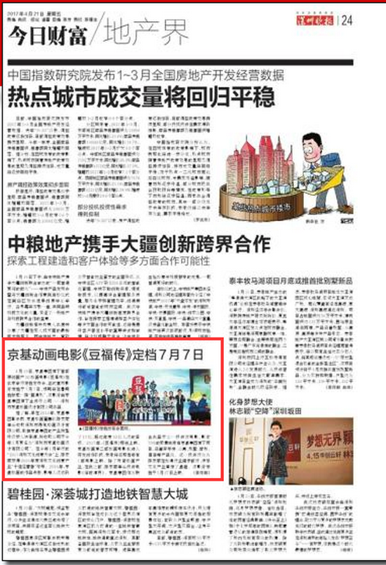 据了解,早在2014年,京基集团副总裁、京基动画董事长陈家荣牵头收购深圳市昂驰动画设计有限公司,助推京基集团的产业转型升级步入快车道,所收购公司于今年2月更名为“深圳市京基动画设计有限公司”。在今年1月举行的“2017深圳文化创意大会”上,陈家荣获得2016年度深圳文化创意产业“十佳经营者”称号。2016年,京基动画的作品点击、影响人次达到了13亿,超过年度10亿人次的目标。2017年,《豆福传》即将上映,京基动画第二部动画电影也进入开发创作阶段,未来将实现每年有1部电影上映。除了布局动画产业,在此之前,陈家荣牵头投资电影《临时演员》。京基集团作为联合出品方之一投资该电影,影片70%的取景地来自京基集团旗下项目,涵盖写字楼、公寓、别墅、商场、酒店等产品线。这一投资行为为陈家荣在动漫行业阔步前行、涉足文化产业奠定了基础。该影片定档于5月27日上映。