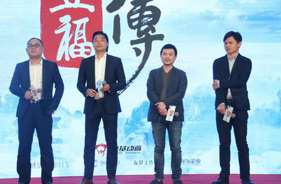 影片出品方、发行方相关领导上台分享投拍《豆福传》的初心,从左往右分别是:京基集团常务副总裁、京基动画副董事长熊伟,京基集团副总裁、京基动画董事长陈家荣,微影时代副总裁杨丹、《豆福传》制片人姜辉