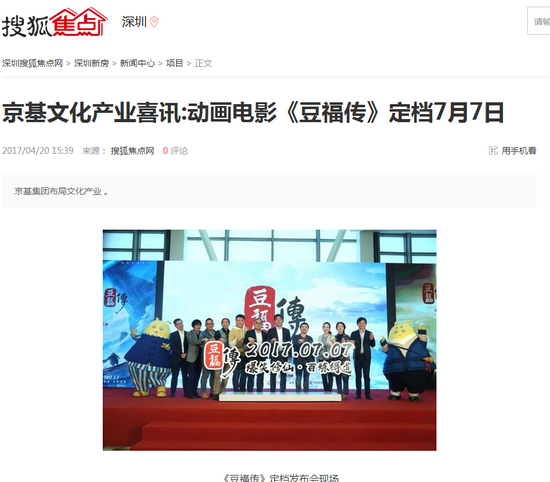 2017年4月19日,京基集团旗下首部原创国产3D动画电影《豆福传》在北京举行定档发布会,正式宣布影片定档7月7日,预期将在暑期档掀起一阵“国漫热”。该影片由京基集团旗下全资子公司——深圳市京基动画设计有限公司(以下简称“京基动画”)出品,北京微影时代科技有限公司、娱跃影业(天津)有限公司、霍尔果斯友梦文化传播有限公司、星乐伟业(北京)文化传播有限公司联合发行。京基集团副总裁、京基动画董事长陈家荣先生,京基集团常务副总裁、京基动画副董事长熊伟先生,微影时代副总裁杨丹先生、微影时代助理副总裁王小盟女士,《豆福传》制片人姜辉先生、刘晨光先生、总导演邹燚先生、执行导演郭磊先生、动画导演蒙智慧先生等出席发布会。
