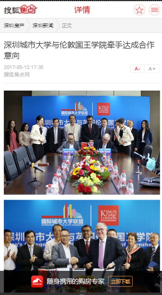 2017年5月11日上午,深圳城市大学与英国伦敦国王学院二度牵手,在京基100大厦A座72楼签订合作框架协议,约定未来双方的教育合作将实现全面化。这是继去年12月份双方就深圳城市大学下属的“大健康学院”和“物联网学院”项目签署相关合作协议后的再次携手。
