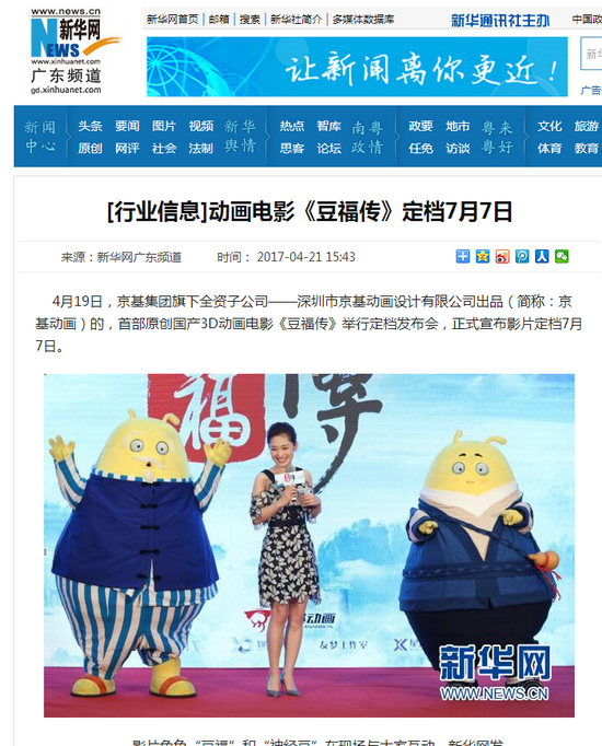 4月19日,京基集团旗下全资子公司——深圳市京基动画设计有限公司出品(简称:京基动画)的,首部原创国产3D动画电影《豆福传》举行定档发布会,正式宣布影片定档7月7日。