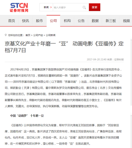 2017年4月19日,京基集团旗下首部原创国产3D动画电影《豆福传》在北京举行定档发布会,正式宣布影片定档7月7日,预期将在暑期档掀起一阵“国漫热”。该影片由京基集团旗下全资子公司——深圳市京基动画设计有限公司(以下简称“京基动画”)出品,北京微影时代科技有限公司、娱跃影业(天津)有限公司、霍尔果斯友梦文化传播有限公司、星乐伟业(北京)文化传播有限公司联合发行。京基集团副总裁、京基动画董事长陈家荣先生,京基集团常务副总裁、京基动画副董事长熊伟先生,微影时代副总裁杨丹先生、微影时代助理副总裁王小盟女士,《豆福传》制片人姜辉、刘晨光、总导演邹燚、执行导演郭磊、动画导演蒙智慧等出席发布会。