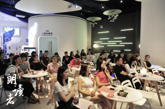 “传说中的天方国,有一对神鸟,雄为凤,雌为凰。”打头阵的是,来自商业公司的廖竹雯对《凤凰涅槃》的低吟浅唱,拉开了整场活动的序幕。标准的发音、充沛的情绪,1号选手廖竹雯一开始就让现场的观众进入了朗读者的比赛氛围。“在我朗读作品之前,先请大家一起来看一段视频。”京基动画的龚国徽用别开生面的方式,让观众通过《放牛班的春天》视频片段,进入他所带来的朗读作品里。一袭白衣、手捧书本的他,用低沉而又深情的腔调,娓娓向观众述说着《穿着蓝色上衣男人》的故事。