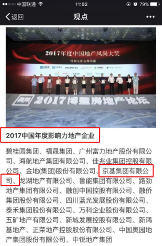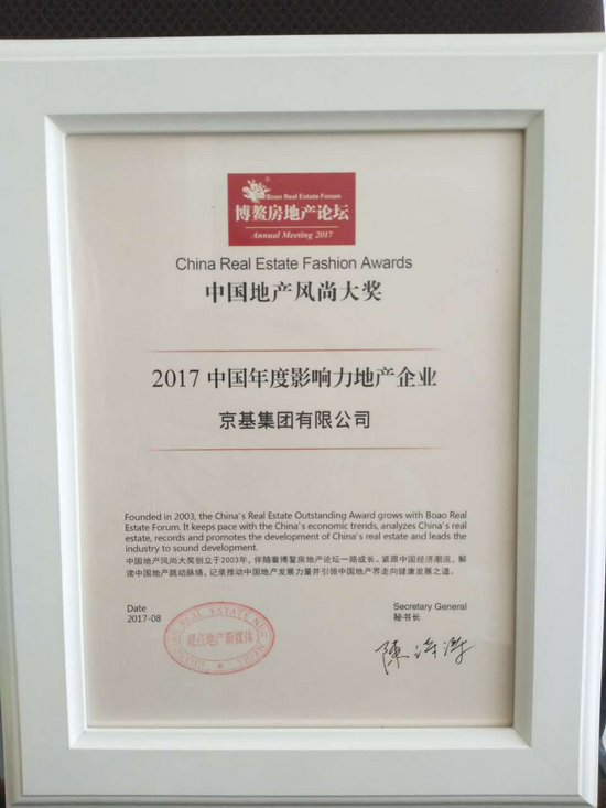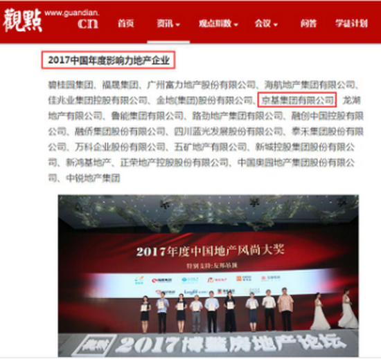 2017年8月7日至10日,以“跨越与去地产化浪潮”为主题的2017博鳌房地产论坛在海南举行。本届论坛由观点地产新媒体主办,每日经济新闻、华夏时报、搜狐焦点、今日头条联合主办,邀请了住房和城乡建设部原办公厅主任、中国房地产业协会原副会长朱中一,中国社会科学院研究生院城乡建设经济系主任陈淮,中国房地产开发集团理事长孟晓苏,著名经济学家、国民经济研究所所长樊纲,中国银行业协会首席经济学家巴曙松等政府协会、经济金融、房地产界重量级嘉宾现场演讲与对话。8月8日晚,“2017年度中国地产风尚大奖”隆重揭晓,京基集团与万科企业、碧桂园集团、佳兆业、金地集团、融创中国等上市房企共同获得“2017中国年度影响力地产企业”荣誉称号。