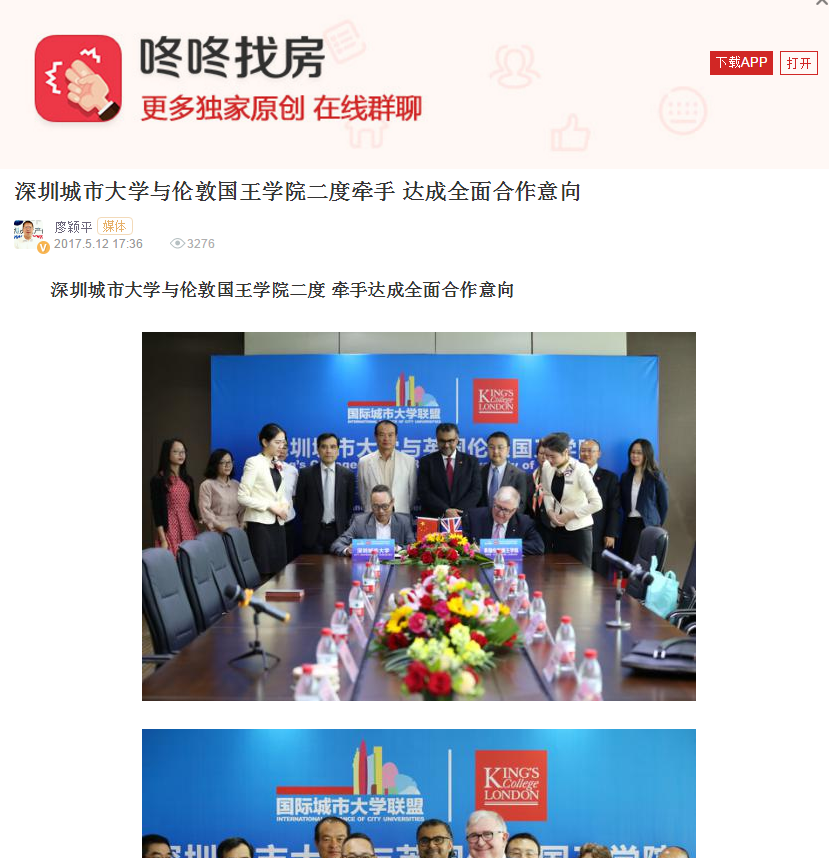 [咚咚咚找房APP]深圳城市大学与伦敦国王学院二度牵手, 达成全面合作意向